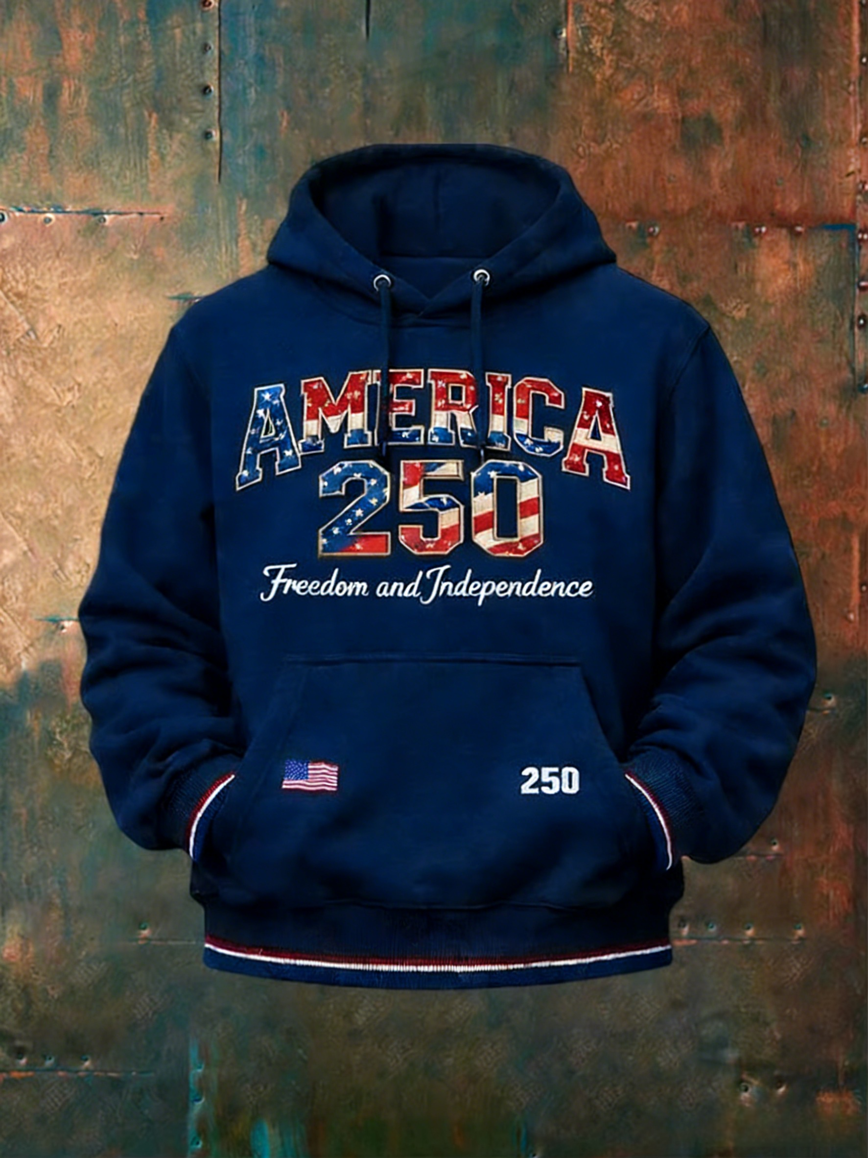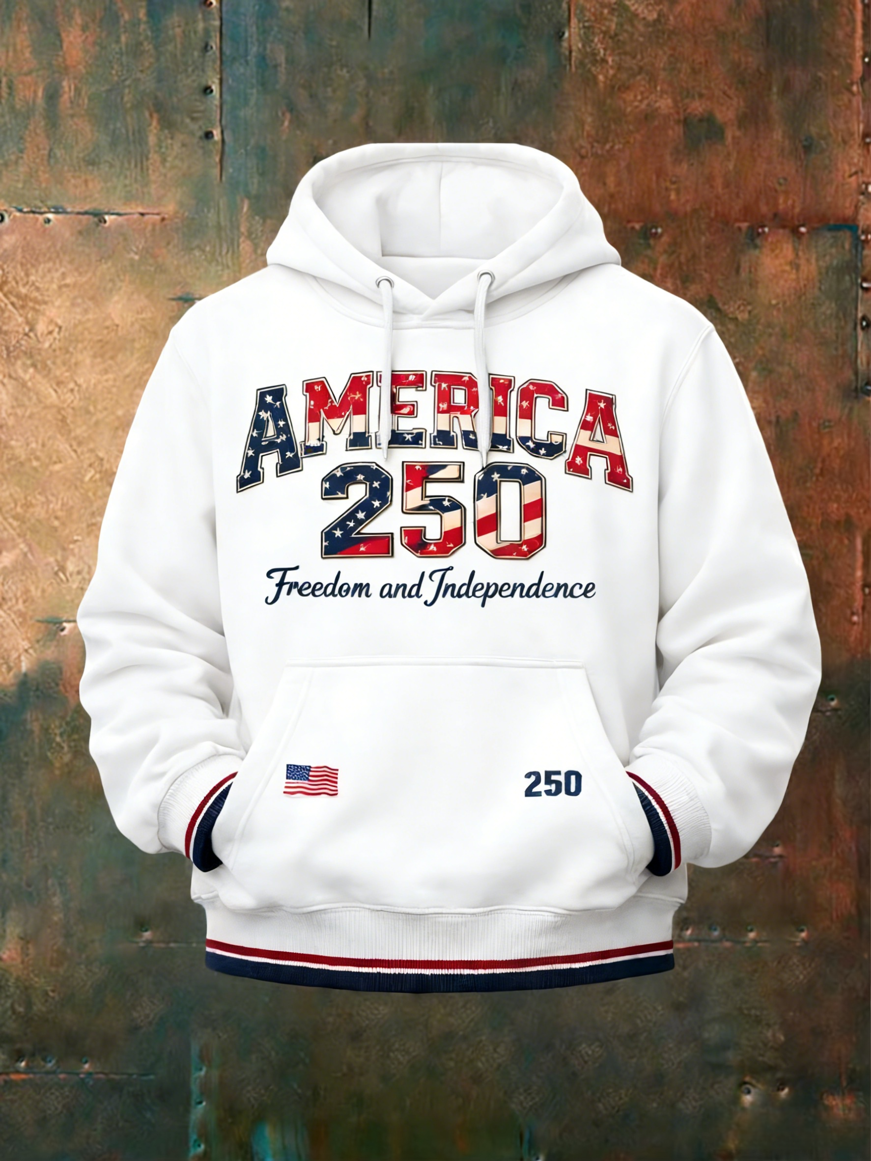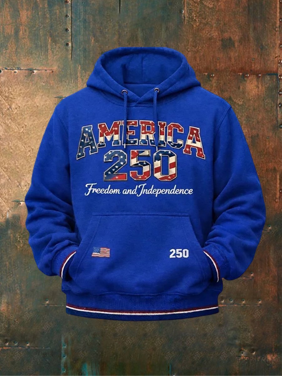 The front features a vibrant “AMERICA” graphic filled with stars and stripes, paired with a striking “250” logo that echoes the flag’s red, white, and blue palette. Below it, the phrase “Freedom and Independence” pays tribute to the nation’s founding ideals. Small details like a mini flag on the kangaroo pocket and “250” branding on the cuff add subtle, stylish nods to the anniversary.