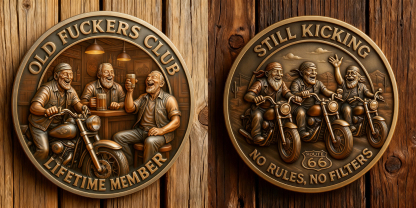 Rich Embossed Detail – Deeply sculpted relief captures every grin, wrinkle, and pint of beer, framed by bold text: “OLD FUCKERS CLUB – LIFETIME MEMBER.”